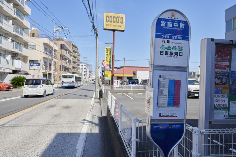 <行き>【宮前中町で降車】・日92 系統<南綱島住宅経由>日吉駅東口行き・・・aのりば【一本橋または日吉5丁目で降車】・日93 系統<駒岡経由>日吉駅東口行き ・・・bのりば